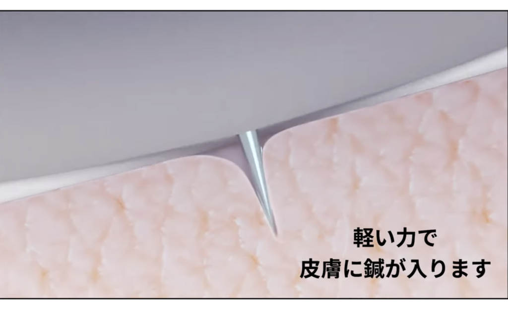 162本の鍼長0.2mm~0.3mmで極小(最大線径0.08mm)の医療グレードステンレス製マイクロニードルが90度の角度で当たることで、肌を傷つけることなく、肌再生を促し、有効成分が最適に吸収されるよう設計されております。